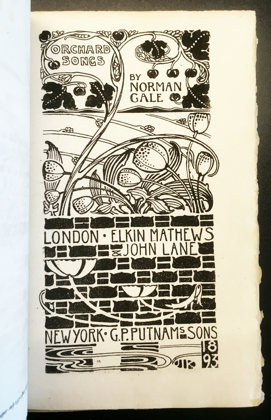 35. GALE, Norman Orchard Songs. London – New York, Elkin Mathews & John Lane – G.P. Putnam & Sons, 1893. Original vellum. (4), 112, 16 p. Printed in 150 copies on handmade paper. 1st edition. Some little spotting on the binding, otherwise fine. With a neatly calligraphed inscription by ‘M.A. Bennett/ Pembroke College’.