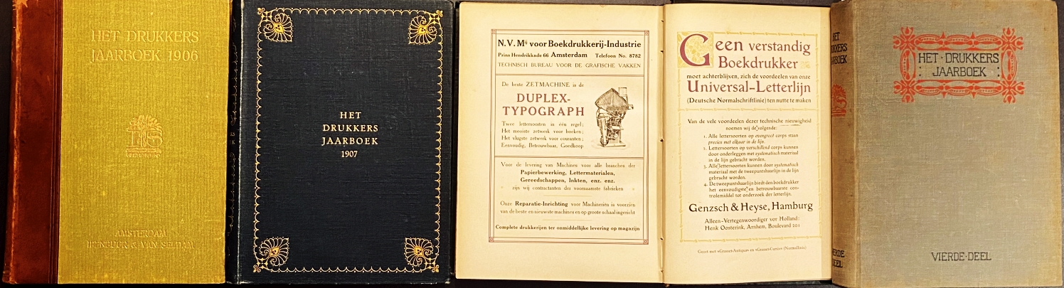 28. DRUKKERSJAARBOEK Het Drukkers Jaarboek voor 1906, 1907, 1908 en 1911. Compleet in 4 jaargangen. Amsterdam, Ipenbuur & Van Seldam, 1906-1911. Halfleer en linnen. (12), 204, (36); (8), 216, (52); (8), 272, 56; (12), 198; (60) p. Geïllustreerd in kleuren. Met telkens aan het eind een omvangrijk advertentiedeel. 1e druk. Wat gebruikssporen. Mooie exemplaren, alle voorzien van het exlibris van Huibrecht van Krimpen.