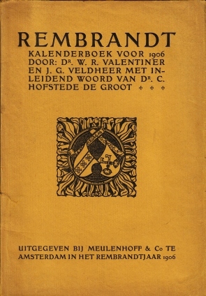 86. (VELDHEER, J.G.). Wilhelm R. VALENTINER Rembrandt kalenderboek voor 1906. Met een inleidend woord van C. Hofstede de Groot. Amsterdam, Meulenhoff, 1906. 30 x 21 cm. Original decorated wrappers. 48 p. Decorated by J.G. Veldheer. Article (in Dutch) by Valentiner set from Grasset’s type, with tipped-in and tinted illustrations of Rembrandt’s works. With a calendar of 12 leaves comprising drawings from various places in Leyden and Amsterdam where Rembrandt lived, all in Art Nouveau botanical frames. 1st edition. Some wear and a bit soiled.