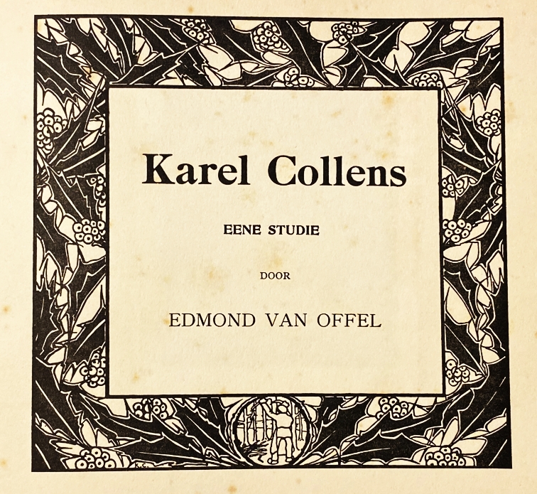 76 b. (SCALDEN). OFFEL, Edmond Van Karel Collens. Eene studie. 6e Jaarboek van de Scalden. [Antwerpen], De Scalden, 1903. Oblong 21 x 25 cm. Linnen met twee lederen etiketten in jugendstil en twee linten. 52 p. Met twee ingeplakte kunstbijlagen op grijs papier. Gedrukt door J.E. Buschmann. Rijk geïllustreerd in verschillende kleuren. 1e druk. Sigarenlucht. Band verbruind, papier wat roestig.