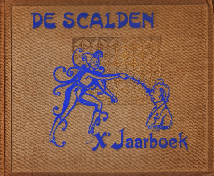 76 a. (SCALDEN). OFFEL, Edmond Van Xe Jaarboek van de Scalden 1907. Humoristisch album. [Antwerpen], De Scalden, 1907. Oblong 21 x 25 cm. Gedecoreerd linnen. 72 p. Met twee ingeplakte kunstbijlagen oplevens grijs papier. Gedrukt door De Vos & Van der Groen. Rijk geïllustreerd in verschillende kleuren. 1e druk. Lichte sigarenlucht. Band verbruind en iets gesleten. Voorste kneep enigzins los.