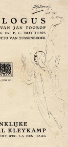 * Fine pen drawing (20 x 8 cm) on the title page: an angel, monogrammed ‘J.Th.T’. Fully signed top right ‘J.Th.Toorop/ Juli 1921/ den Haag’.