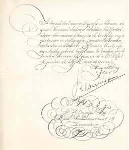 2. (COLLECTIE R.M. NIJHOFF). OUWEJAN Kzn, R.J. Gecalligrafeerde brief aan de verzamelaar R.M. Nijhoff te Wijk bij Duurstede. Gevouwen blad geschept papier met watermerk ‘Gelria’ en wapen van Gelderland, beschreven op p. 1 en 3 in rijkelijk krullende kalligrafie, gedateerd ‘Zaandam, 6/3 A.D. 1953’. 21 regels. Gesigneerd ‘R.J. Ouwejan Kzn.’ met adres te Zaandam.