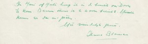 * Voor een tentoonstelling in het kader van de Boekenweek zouden een foto en een stuk tekst moeten worden uitgeleend. Blaman vraagt de foto na gebruik terug te sturen, omdat ze maar één voor dit doel geschikte heeft. Een handschrift heeft ze niet, omdat ze alle kladjes na gebruik onmiddellijk weggooit. Maar Gregoor zou deze aan hem gestuurde brief daarvoor kunnen gebruiken (de reden, vermoedelijk, waarom achterop een stempel ‘Archief Nol Gregoor’ is aangebracht). ‘Rekening houdend met de mogelijkheid dat U dit een oplossing zou vinden, zal ik in deze dus maar niets scandaleus schrijven!’.