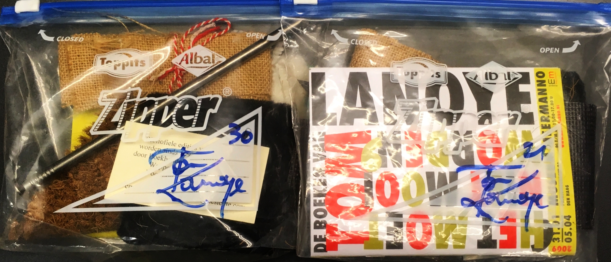 26. (LANOYE, Tom). CAPELLEVEEN, Paul van Het moet niet mooi worden. De boeken van Tom Lanoye. Den Haag, Museum Meermanno, 2009. Geniet boekje (32 p.) met een selectie van boekbandmaterialen (kokosmat, tapijt, jute, golfkarton, aluminium, schuurpapier, draadnagel, tricolore dweil, canvas) in diepvrieszakje. Vervaardigd in 45 door Lanoye genummerde en gesigneerde exemplaren.