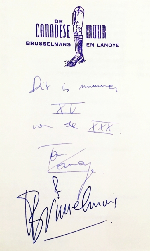 21. LANOYE, Tom, en Herman BRUSSELMANS De Canadese muur. Amsterdam, Bert Bakker, 1989. Linnen (Handboekbinderij De Pers). 140 p. 1e druk.