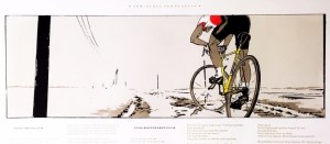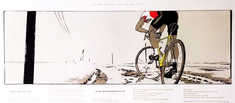 * Deze rijmprent bevat het enkele jaren eerder in eigen beheer in boekvorm verschenen gedicht ‘Gent-Wevelgem’ van Tom Lanoye, broederlijk geflankeerd door Brusselmans’ reactie ‘Luik-Bastenaken-Luik’. De litho van Dooreman verbeeldt een eenzame wielrenner op de kasseien. Nooit eerder gezien. Onvindbaar.