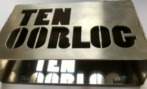 22. LANOYE, Tom, en PERCEVAL Ten oorlog. Amsterdam, Prometheus, 1997. Drie delen. Metalen platten, bijeengehouden door perkamenten stroken; in metalen cassette (Handboekbinderij De Pers & Nico Spijkers). 112; ?; ? p. 1e druk.