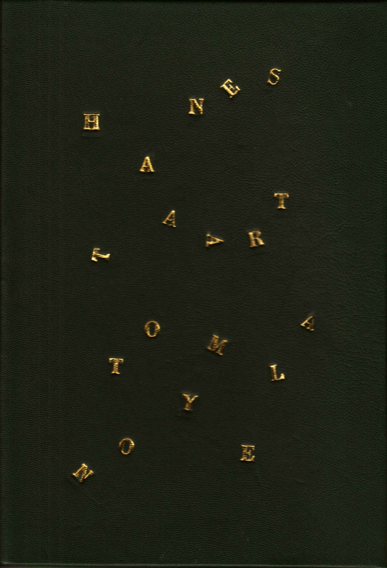 6. LANOYE, Tom Hanestaart. Amsterdam, Bert Bakker, 1990. Vier onopengesneden katernen, genaaid in een uitsparing in een vergulde, groenlederen overslagdoos in boekvorm, met onzichtbare magneetsluiting (26,3 x 18,6 cm); in de belettering op het voorplat zijn in speelse typografie de kromme veren van een hanenstaart te herkennen [Rob Hemker]. 68 p. 1e druk.