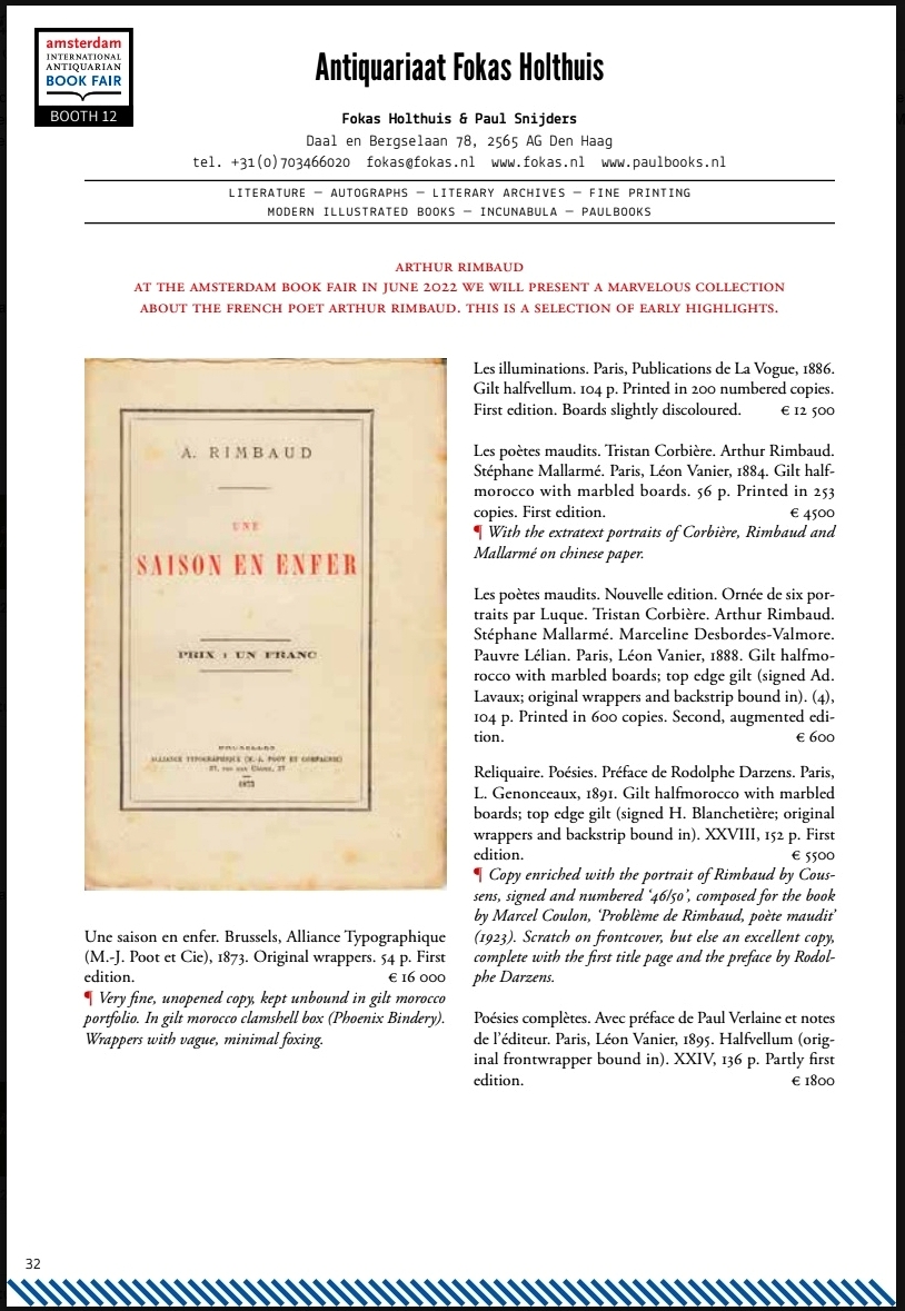 Onze catalogus 85, bestaande uit onze collectie-Rimbaud, ruim 100 titels, verscheen onlangs, hij staat hier: