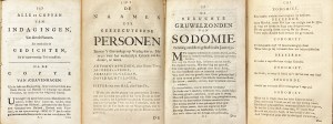* ‘Spectacle of both the executed and the accused for the abominable Crime of sodomy, opened in the principal Cities of Holland and Over-yssel, etc., as a warning to the good and a deterrent to the evil.’ This large-format book, with its headlines set in big capital letters, spreads dread and terror with its summonses, verdicts, and long lists of culprits, followed by 42 thundering poems.
