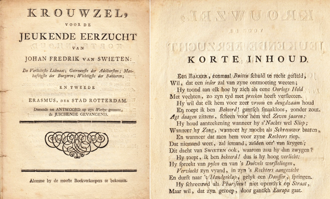 J.F. van Swieten, an esteemed baker in Rotterdam, was accused but soon acquitted of sodomy after he had proven his innocence, piously citing numerous psalms and Bible passages. The second pamphlet, a long rhyming poem, is directed against him. The ‘Krouwzel’ pokes sarcastic fun at Van Swieten’s jubilant, biblical thunder and satirises his self-righteousness: Van Swieten doth protest too much. The first pamphlet is rare (2 copies in Dutch libraries), the second virtually unknown (no copies in the libraries), and the text not published elsewhere.
