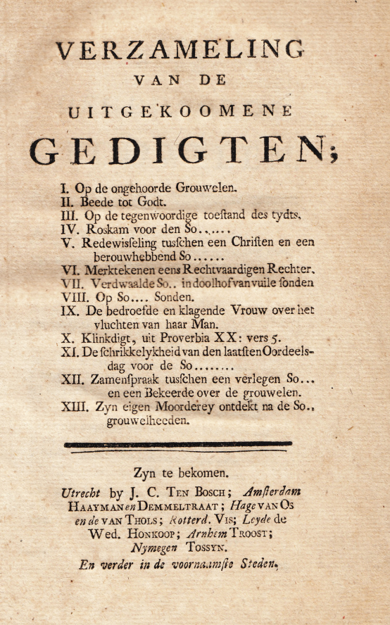 1. Verzameling van de Uitgekoomene Gedigten. I. Op de ongehoorde Grouwelen. (And 12 others. One by A. Hardy, the others by several pseudonyms and some anonymous). Utrecht etc., J.C. ten Bosch etc., (about 1764). 42 p.
