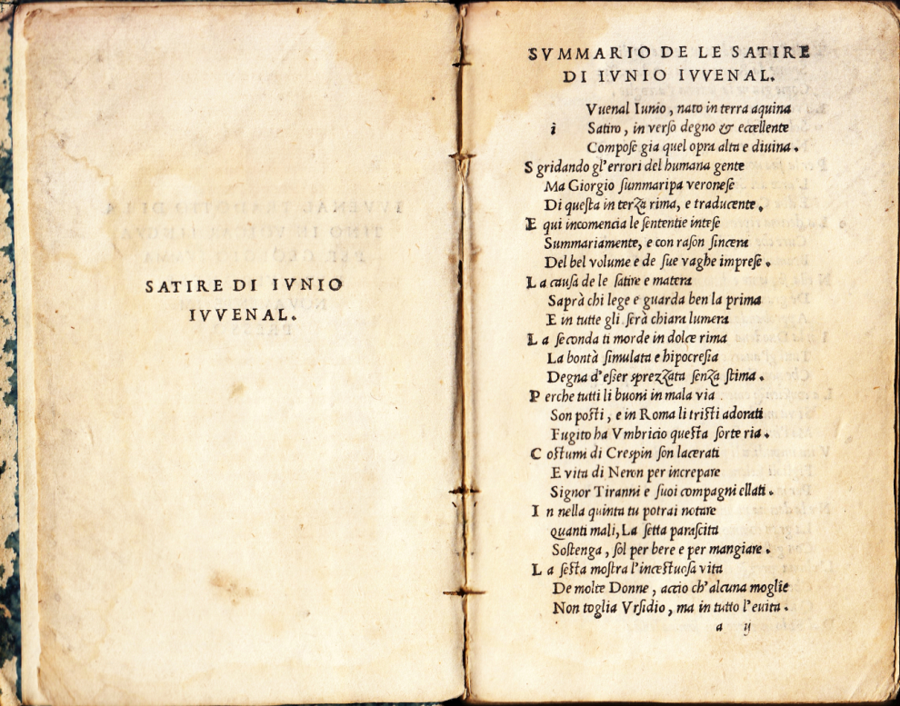 * Faithful translation into Italian by Giorgio Sommariva (1435-1497), a lawyer and member of the City Council of Verona. With an introduction by Summa Ripa / Sommariva in verse, where he sums up the themes in the sixteen Satires. In the three poems where homosexual love and sex is alluded to, it is consequently called sodomy, or the sodomitical sin, that to judge from these poems was considered well-known in his days. In Mediterranean countries, sodomy was often part of male socialization. The late fifteenth century saw attempts to eradicate this behaviour.