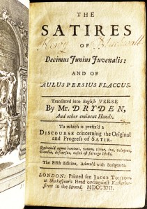 13. 1713. JUVENALIS, Decius Junius, & Aulus Persius FLACCUS The satires of Decimus Junius Juvenalis and of Aulus Persius Flaccus. Translated into English verse by Mr. Dryden, and other eminent hands. Together with the Satires of Aulus Persius Flaccus. Made into English by Mr. Dryden. With explanatory notes at the end of each satire. To which is prefix’d a discourse concerning the original and progress of satire. London, Jacob Tonson, 1713. 13.5 x 8 cm. Contemporary calf. (162) [misnumbered for (142), 2], 372 p. Frontispiece, 22 plates (one for each poem) and 2 portraits. Separate title page for Persius’s ‘Satyrs’. Contemporary calf, a bit rubbed, corners worn, hinges starting. With inscriptions: page numbers pointing to marked passages, and two owner’s signatures, of Henry Blackwall and Daniel Astle[y].