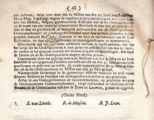 * ‘Letter from the six Sub-Quartiers in the Ommelanden between the Eems and Lauwers, namely (…) Written to the Honourable Gentlemen to justify on the one hand the fairness of the Redress demanded by the aforementioned six Sub-Quartiers in the administration of Criminal Justice in capital or death penalty cases occurring in the Ommelanden, And on the other hand to refute and remove the objections and evasions thereto, both by the Member of the City, and by the dissenting Lords of the three other Sub-Quartiers (…).’ Purely legal argument about the division of power of the lords of the western lands of the province of Groningen, directed against Rudolf de Mepsche and his associates, signed in print by Lewe, Clant and the five other lords that De Mepsche tried to harm with his sodomite trial. The memorandum of redress is announced here.