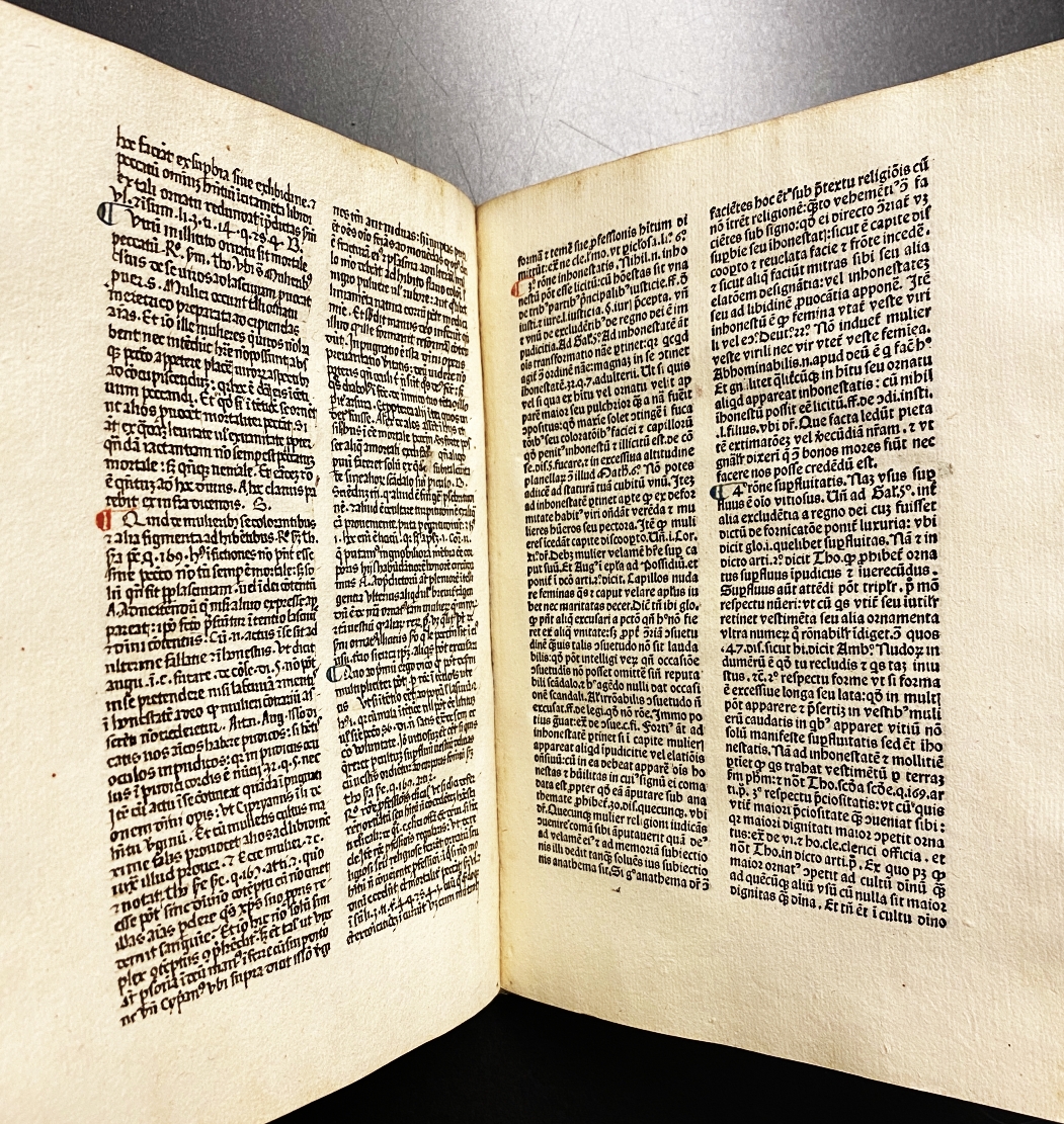 1. 1472. GERSON, Johannes De cognitione castitatis et de pollutionibus diurnis. Forma absolutionis sacramentalis. [Cologne, Printer of Dares (=Johannes Solidi (Schilling)), about 1472]. 20 x 15 cm. Recently bound in a handwritten vellum leaf dating from the earlier fifteenth century (with a fragment of the commentary by the Venerable Bede on the Gospel of St. Luke, chapter 19, incl. some music). 16 leaves (complete). Latin text. Many ligatures and abbreviations. Rubricated and with decorative initials with simple extensions. Several marginal reader’s remarks plus a drawing of a cross, some underlining. Professional paper repairs to blank upper margins. Eleven editions were published between 1467 and 1490. The first was issued in Cologne (1467); this is the fourth, printed anonymously by Johann Schilling – whose name was latinized as Solidi. Excellent condition.