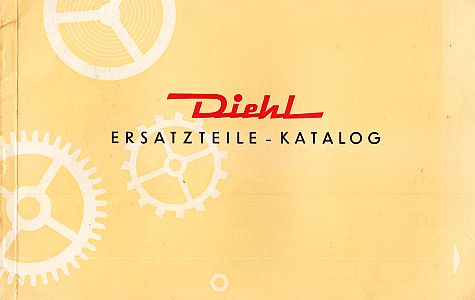 * Cover decorated with various gear wheels. Trade catalog for spare parts of Diehl watches and clocks. Printed in red, beige and black in an attractive design, with many pictures of clocks and parts.