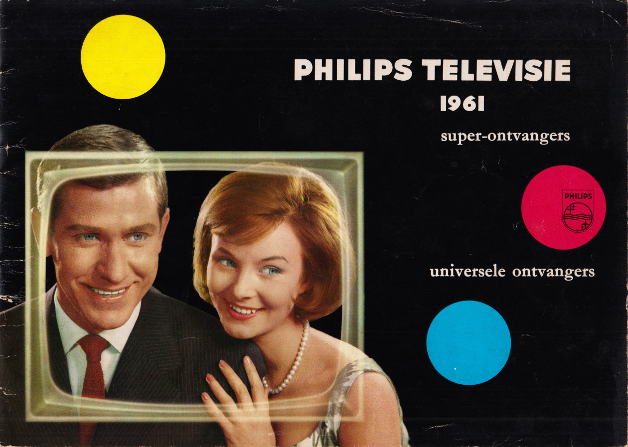 10. PHILIPS Philips televisie 1961. Super-ontvangers / universele ontvangers. [Eindhoven, Philips’ Gloeilampenfabrieken], 1961. Oblong 21 x 29 cm. 16 p. Gedrukt in kleuren. Met foto’s en fotocollages. Los inliggende prijslijst. Buitenkant wat gekreukt.