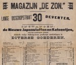 * Leuke en zeer efemere reclamekrant voor textiel van de voorganger van warenhuis Vroom en Dreesmann, Magazijn De Zon. Vóór 1905, toen de winkel in Deventer naar het monumentale (nog steeds bestaande) pand Brink 100 verhuisde. Uit de tijd dat je nog Mans Boezeroenen en Dames Boezelaars kon kopen voor slechts 45 cent of Prima Qualiteit Dril voor Dienstboden Japonnen vanaf 21 cent.