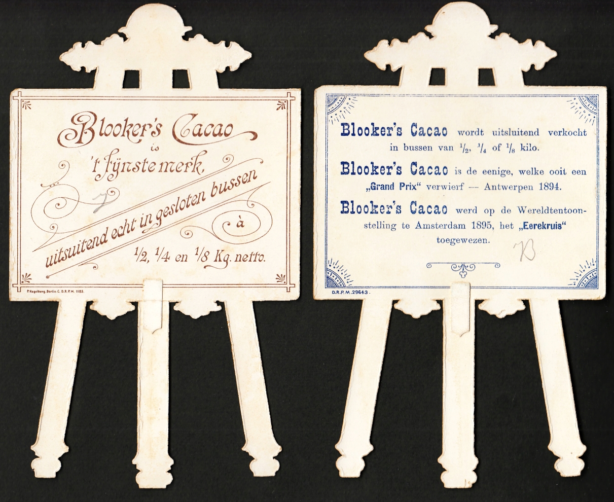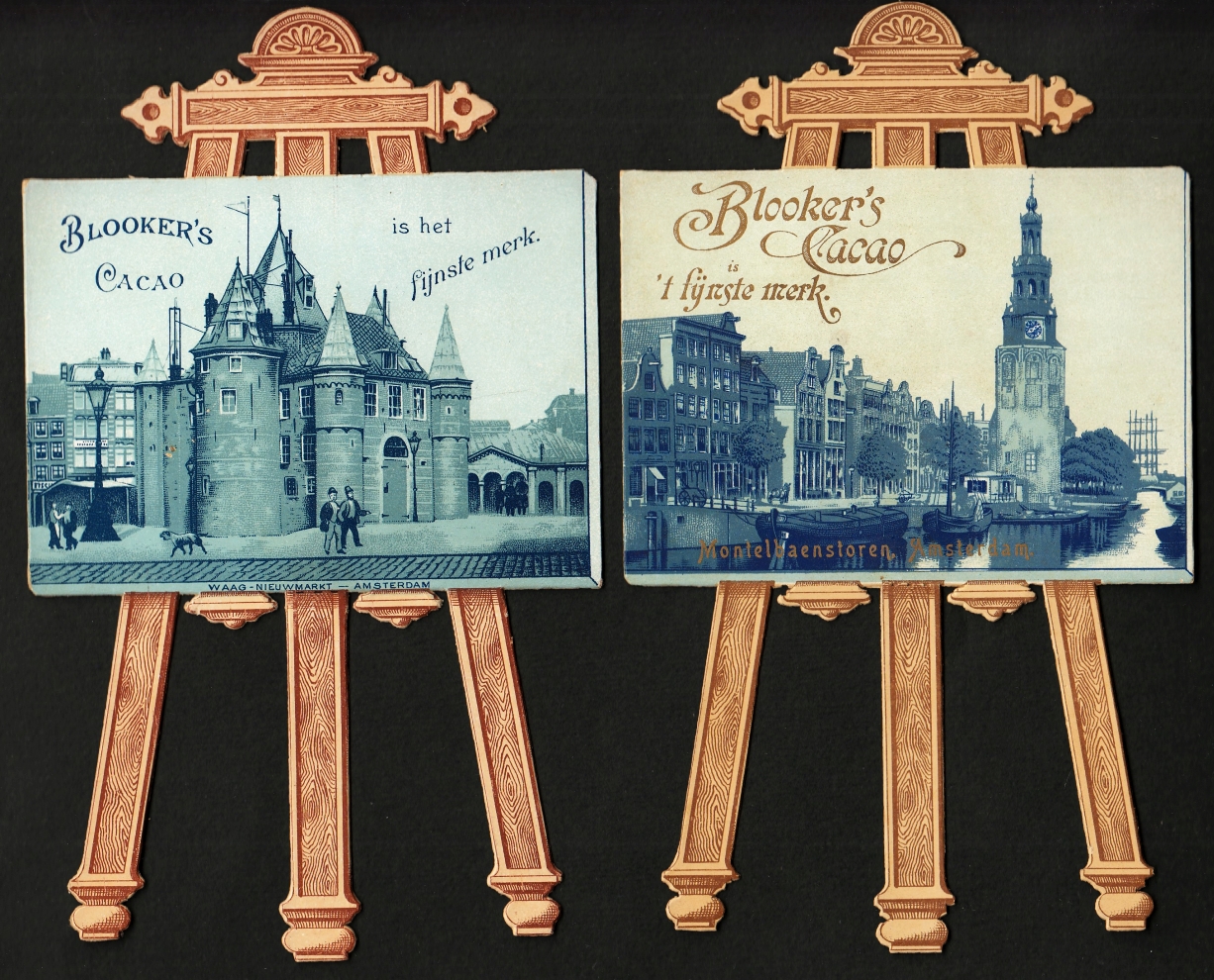 8. BLOOKER’S CACAO Vier kartonnen advertentie-ezels met plaatjes van Amsterdam. [Amsterdam], Blooker, ca. 1910. 18 x 11 cm. Uitgestanst in de vorm van schildersezels met prenten erop, bedrukt in bruin en blauw. Afbeeldingen van de Munt, de Waag, de Zuiderkerkstoren en de Montelbaanstoren. Zeer goede conditie.