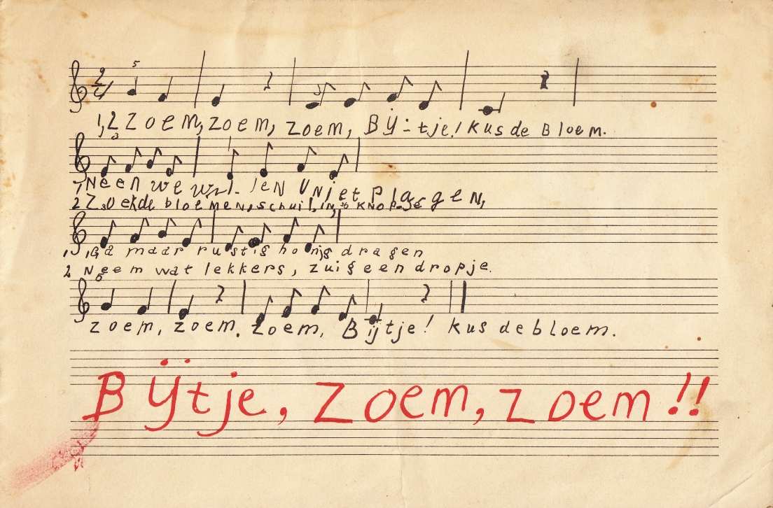 47. SPIER, Jo Bijtje, zoem, zoem!! Amsterdam, Vereeniging Muzieklyceum, [ca. 1935?]. Oblong. 12 p. Naar het handschrift en de tekeningen van Jo Spier, met steunkleuren. Dit boekje is goed gebruikt, want het is gekreukt en gevlekt.