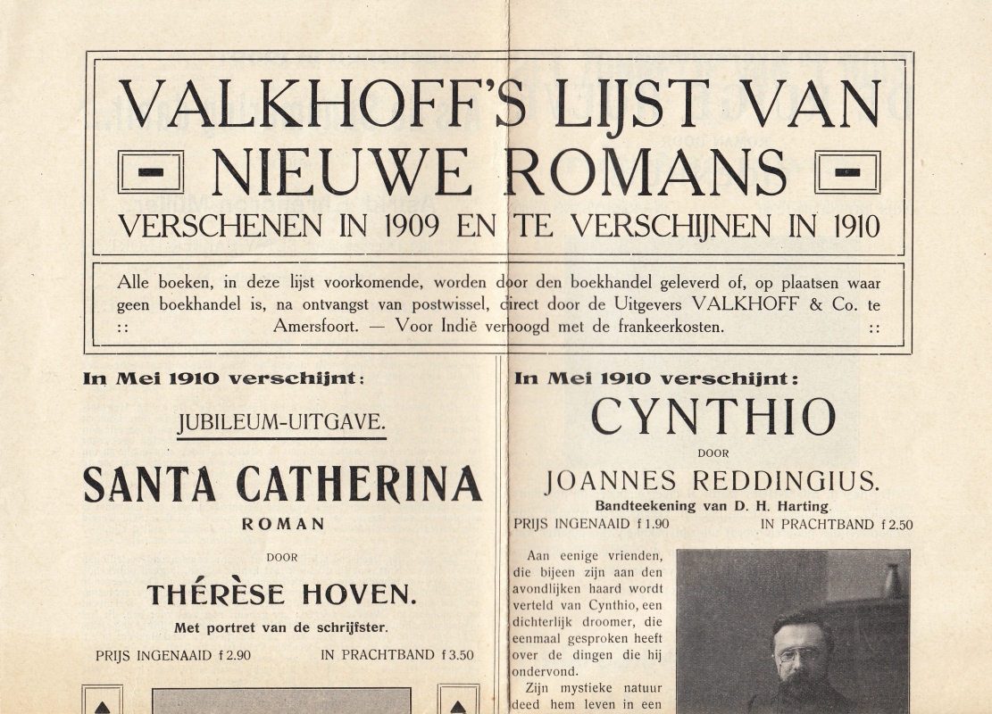 * Boeken van o.a. Thérèse Hoven, Mevrouw Ovink-Soer, Johannes Reddingius, Astrid Ehrencron-Müller, J. Eigenhuis, F.W. Drijver en H.Z. Zegers de Beyl (‘Gekrookt riet’). Meestal met korte inhoud en een hele rij citaten uit recensies. Mooie, gave reclamekrant.