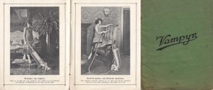 * Prachtig boekje over de in 1927 nog heel recente uitvinding, de elektrische steelstofzuiger ‘Vampyr’, die in 1924 op de markt werd gebracht (en 90 gulden kostte). Op vier foto’s zien we een modieuze jonge vrouw met het apparaat in de weer, de andere foto’s laten zien hoe je het ding in elkaar zet.
