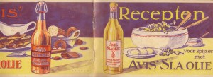 * Fraai getekende reclame voor slaolie en boterolie (voor bakken en braden). De firma Avis reageerde met dit boekje vermoedelijk op een negatieve kritiek in De Reclame (jg. 8, nr. 8, p. 376, 1929) op een oudere, onaanzienlijke versie ervan. Landwehr R009. Jaartal uit Delpher, waar ik een advertentie vond in het tijdschrift De Grondwet van 27-12-1930 met afbeelding van het boekje.