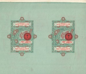 39. (ZUTPHEN, Jan van). LAMPJE-ZEEP Blad met 4 afdrukken van verpakkingen voor de Lampje-Zeep (1923-1928). Diemen, 1923-1928. 37 x 24 cm. Gedrukt in rood, groen en ‘goud’. Zeer gaaf.