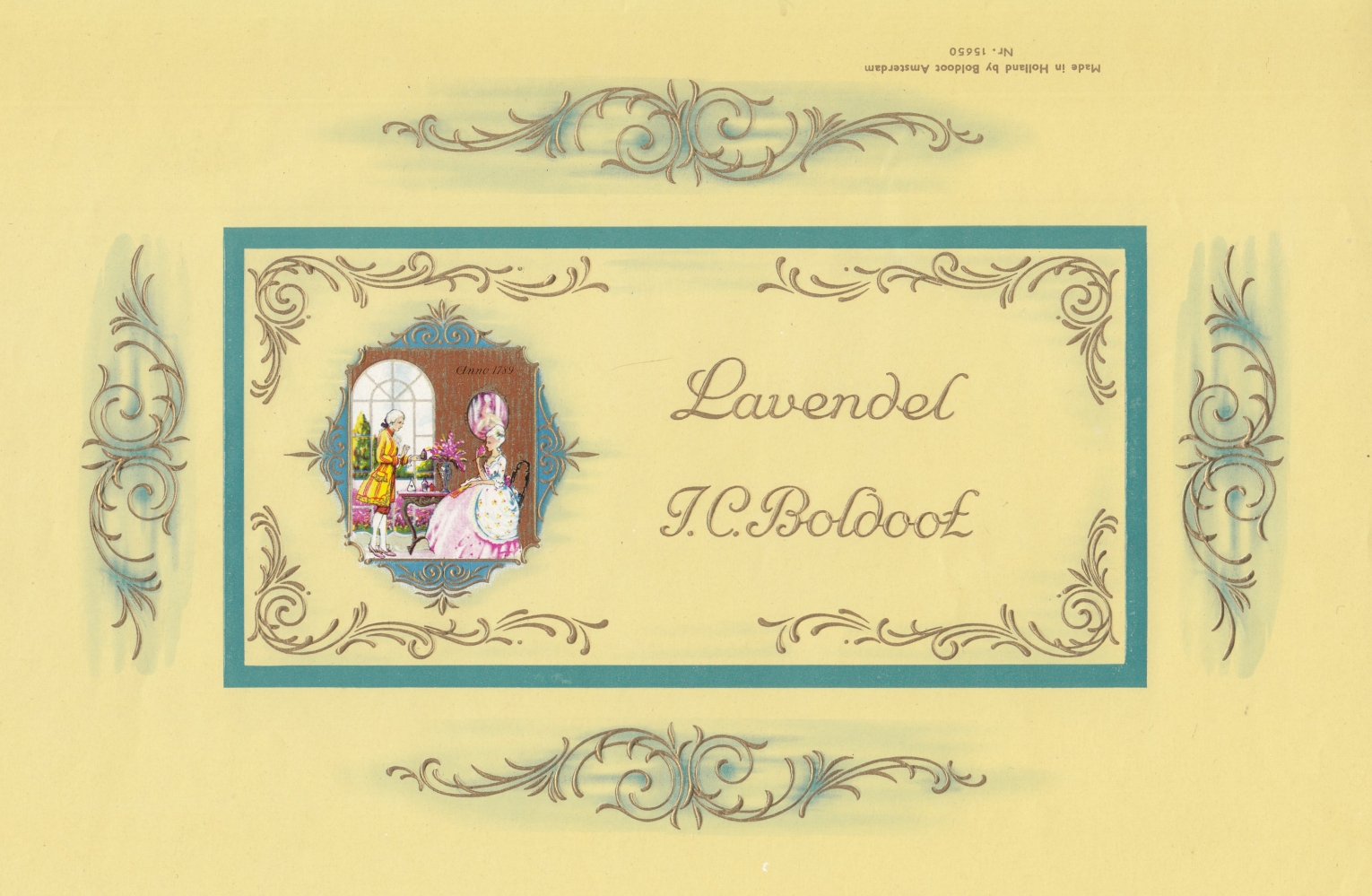 1. BOLDOOT Ongevouwen verpakking voor Lavendel. Amsterdam, J.C. Boldoot, ca. 1940. 18,5 x 27 cm. Eenzijdig bedrukt in geel, groen, goud en een plaatje. Zeer gaaf.