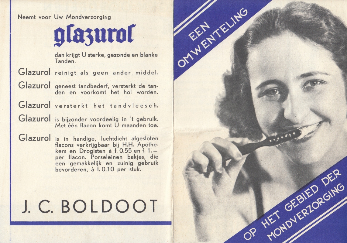 Bijgevoegd: een reclamefolder voor Glazurol, het bruisende tandpoeder van Boldoot, van ca. 1937. Deze tandreiniger werd verkocht van 1924 tot ca. 1975. Vraag ook naar onze Boldoot-advertenties en -verpakkingen.