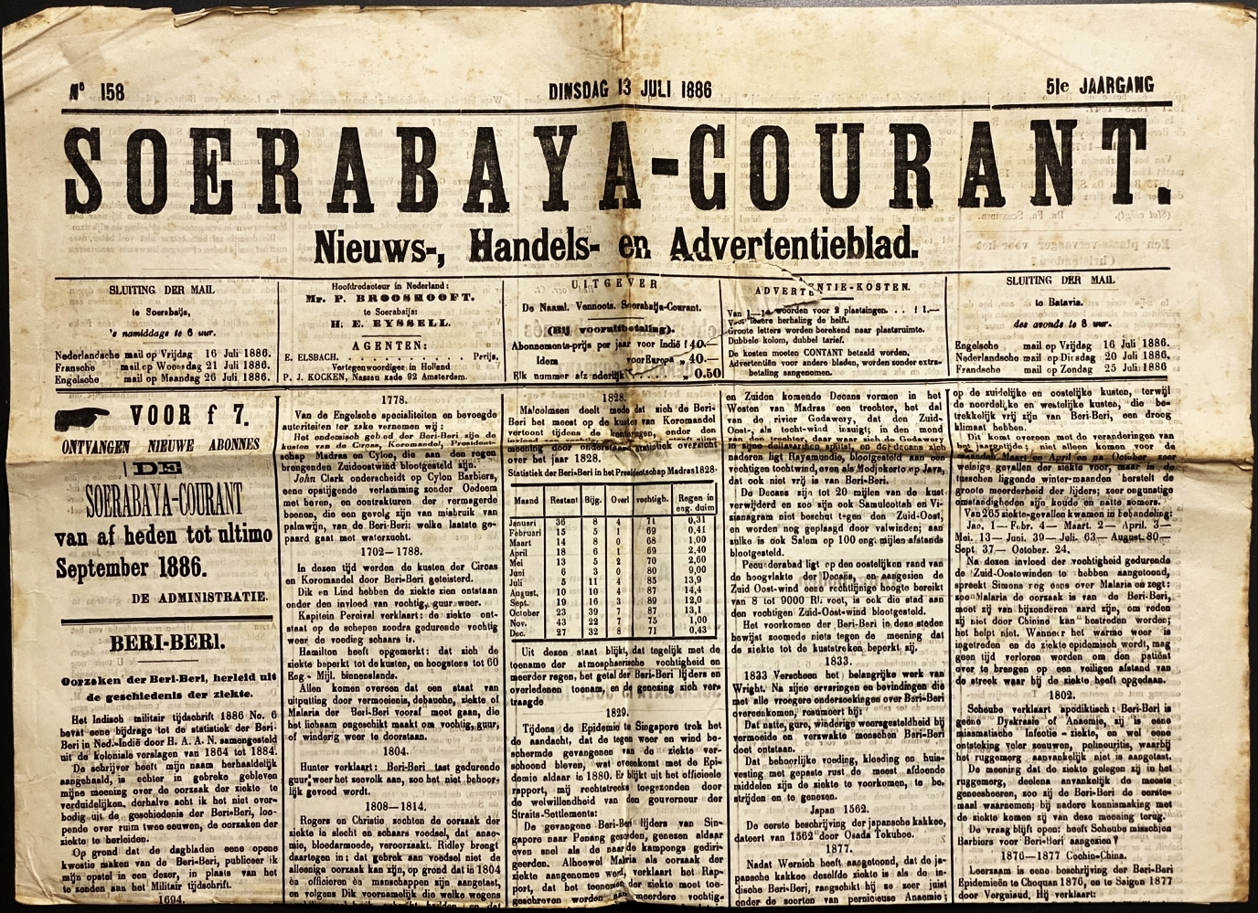 * Deze krant bestond van 1836-1905. In 1885 trad Eyssell aan als redacteur; hij had anders dan zijn voorgangers een scherpe, interessante pen. In deze grootformaat-krant een paginagroot artikel over de geschiedenis van de ziekte beriberi naast allerlei nieuws, plaatselijk en algemeen. Niet te verwarren met het Soerabajaasch Handelsblad. Deze courant niet op Delpher.