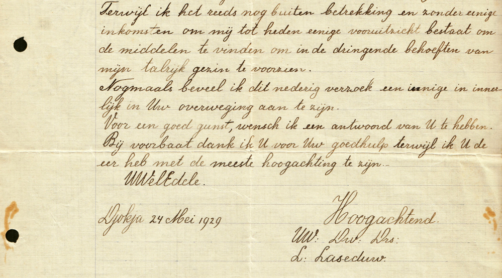 * Ontroerende, pijnlijk nederige, zeer uitvoerige brief van L. Laseduw te Yogyakarta, die ingaat op een eerder gesprek met de hoofd-employé over de functie van snijveldopzichter. Op het moment van schrijven is Laseduw zonder middelen van bestaan, ‘arme en behoeftig’, maar heeft hij een talrijk gezin te voeden. Vol met frasen, die met prachtige nette letters in een soort geëxponentieerde beleefdheid zijn neergepend.