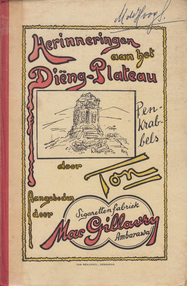 Grappige rijmpjes en tekeningen in de stijl van Wilhelm Busch over het Dieng Plateau, dat gelegen is in de caldera van een vulkaan in Midden-Java en een groot aantal vroegmiddeleeuwse hindoetempels bevat. De identiteit van auteur ‘Ton’ wordt onthuld in een bespreking in het Nieuws van den Dag voor Nederlandsch-Indië van 20 december 1929: het is ‘de heer C.G.Th. Kraemer die te Oengaran (onderneming Sido Redjo) woont’. Met de nodige goede wil kun je die naam ook in de handtekening lezen.