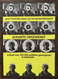 51. WOLKERS, Jan (Indonesië). Geen financiële steun aan het generaalsbewind. Suharto ongewenst. Vrijheid voor 150.000 politieke gevangenen in indonesië. (Affiche). [Comité Soeharto ongewenst, 1970]. 53 x 39 cm. Eenzijdig bedrukt in geel en zwart. Mooi exemplaar.
