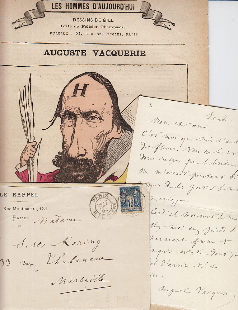 74. VACQUERIE, Auguste 8 Autograph Letters Signed. 8 lettres autographes signées. Huit lettres manuscrits à ‘Mon cher Koning’ et à Mme Koning, demeurants à Marseille. 2 datés: 1881 et 1894. 3 sur papier imprimé Le Rappel, un avec enveloppe. Ajouté Les Hommes d’Aujourd’hui, 8 Novembre 1878, avec portrait d’Auguste Vacquerie et article de Félicien Champsaur.