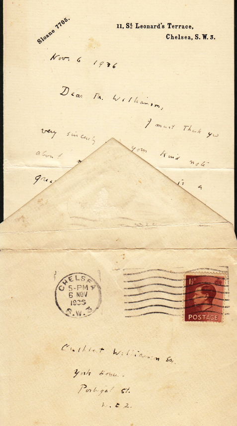13. SMITH, Logan Pearsall Handwritten, signed letter to Cuthbert Williamson, dated 6 November 1936. On headed paper ’11, St. Leonard’s Terrace,/ Chelsea’. Folded sheet, one is blank. 35 lines in scribbled handwriting, running down to the bottom right. Envelope with a stamp of King Edward VIII (who would abdicate a month later, less than a year after his accession). Williamson’s address is ‘York House/ Portugal St.’