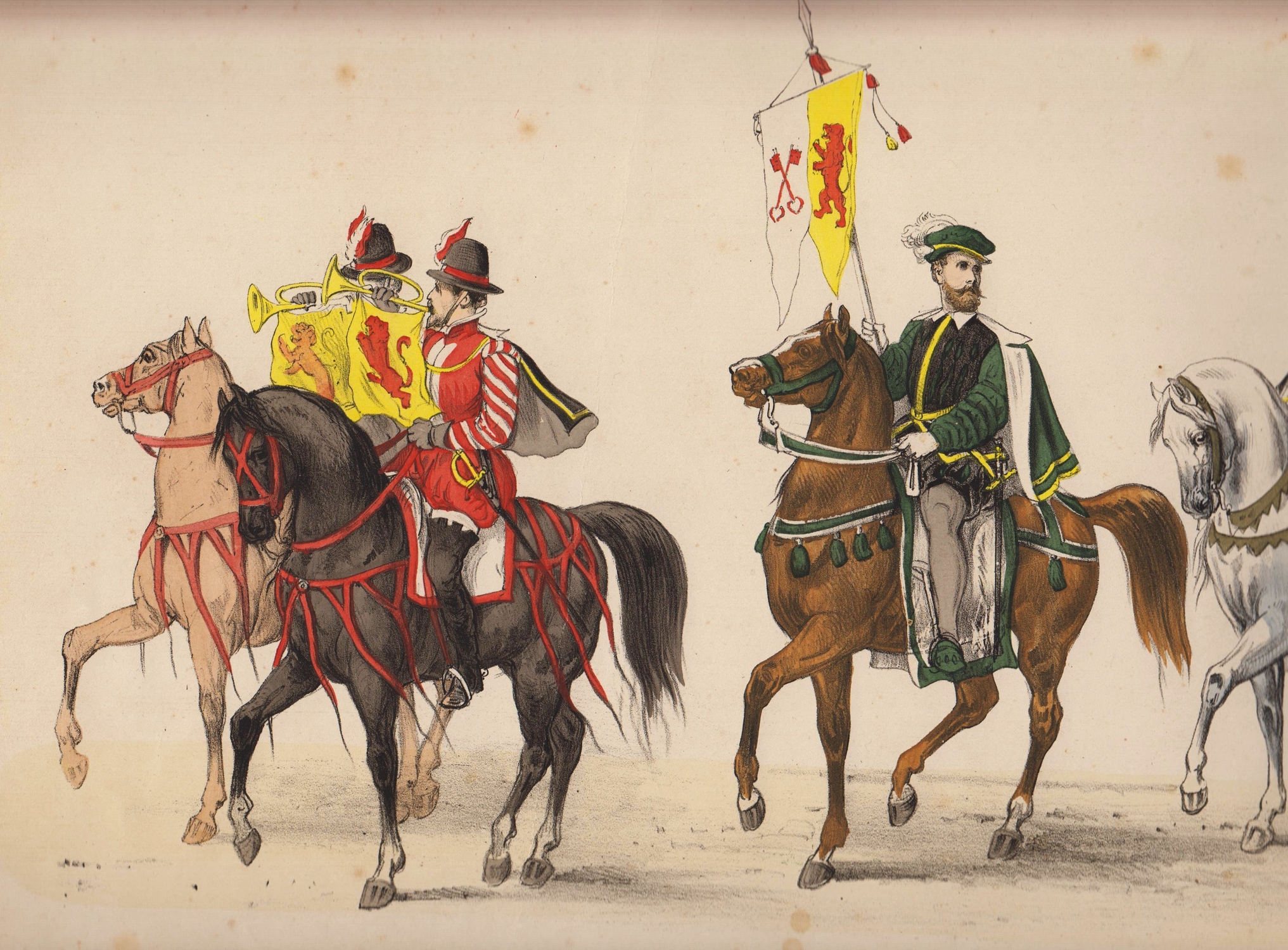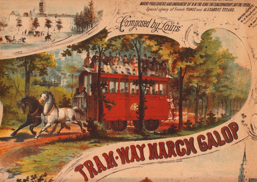 * Koning Willem III met Willem I en Willem II in een centraal cartouche, waaromheen de namen van personen en gebeurtenissen uit het heldhaftig verleden, met afbeelding van een juichende Willem II en vluchtende Fransen bij Quatre Bras, en de aankomst van Willem I in Scheveningen. Met een gedicht van onbekende hand: ‘De dankbre jubeltoonen klinken’. Muller 7344.