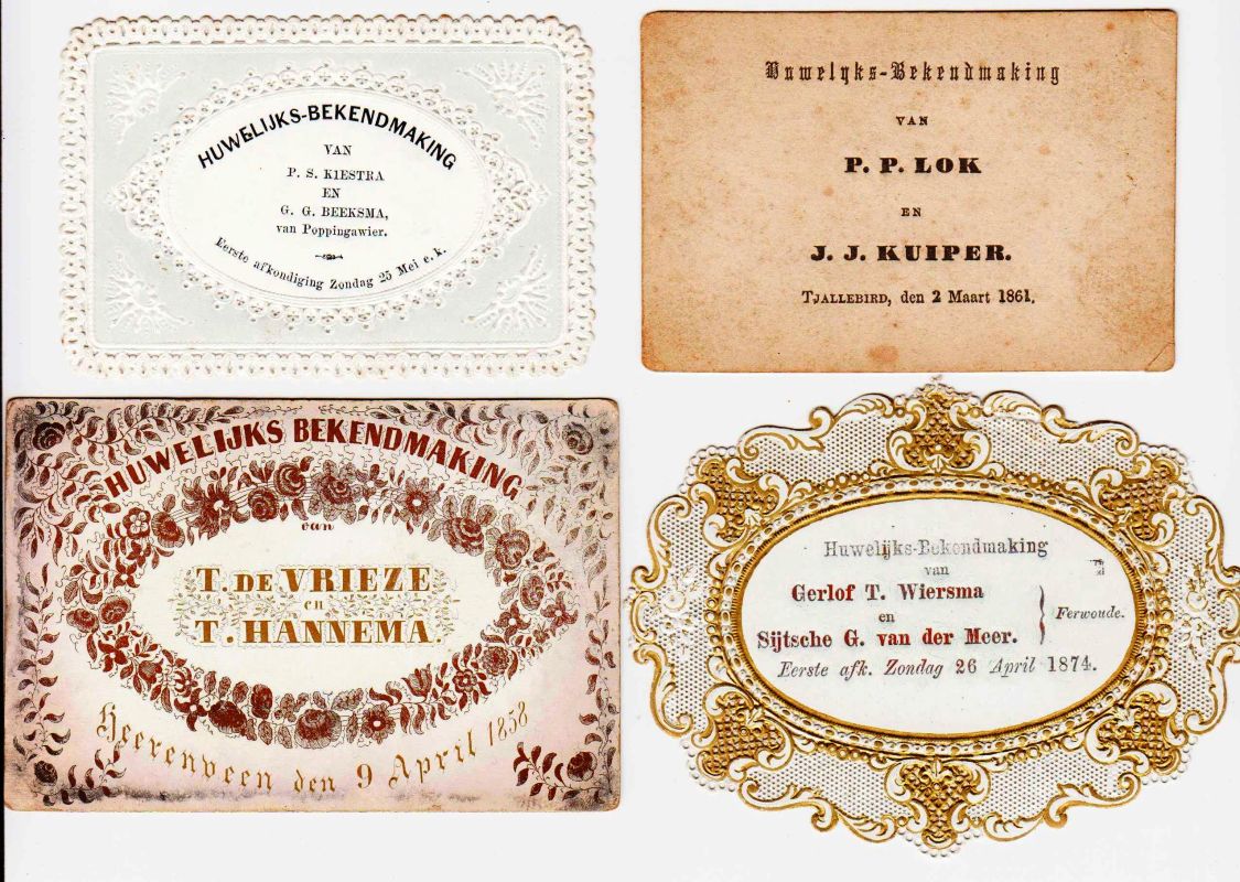 6. HUWELIJKS-BEKENDMAKINGEN UIT FRIESLAND Collectie van 62 huwelijksbekendmakingen uit de periode 1858-1891, alle afkomstig uit de zuidelijke helft van Friesland. Eenzijdig bedrukt in zwart en goud, soms met reliëfdruk en uitgestanste sierranden. Enkele met een lichtblauwe of beige achtergrond. Formaat tussen ca. 7 x 11 en 5 x 7 cm. 2 duplicaten. Met één bekendmaking in afwijkend formaat: een vel gevergeerd papier (27 x 20 cm, voor Jacobus van der Zee en Ybeltje Visser te Boornzwaag), eenzijdig bedrukt in goud! Bijna alle personen waarvan de afkomst genoemd wordt, zijn afkomstig uit de zuidhelft van Friesland. De kaarten worden bewaard in plastic multohoesjes. De conditie is in het algemeen goed; soms ontbreekt een tandje of hoekje, en enkele kaartjes zijn wat vervaagd.