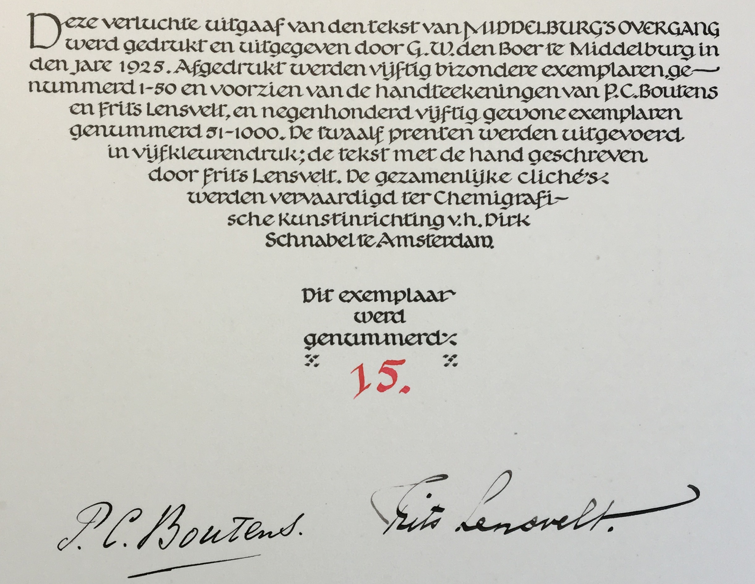 * Eén van de 25 luxe-exemplaren waarin alle houtsneden door Dijkstra gesigneerd zijn. Met een door Dijkstra in potlood geschreven colofon, waarin dit boek nummer 6 heeft gekregen.