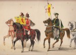 28. WILLEM III, Koning Nederlands herstelling onder het Huis van Oranje. (Historieprent ter viering van 50 jaar koninkrijk). Rotterdam, H. Nijgh, 1863. 60 x 48 cm. Eenzijdig gedrukte lithografie. Met de hand keurig gekleurd: oranje, groen en geel. Randen wat roestig, enkele randscheuren.
