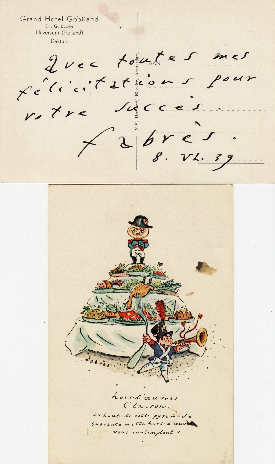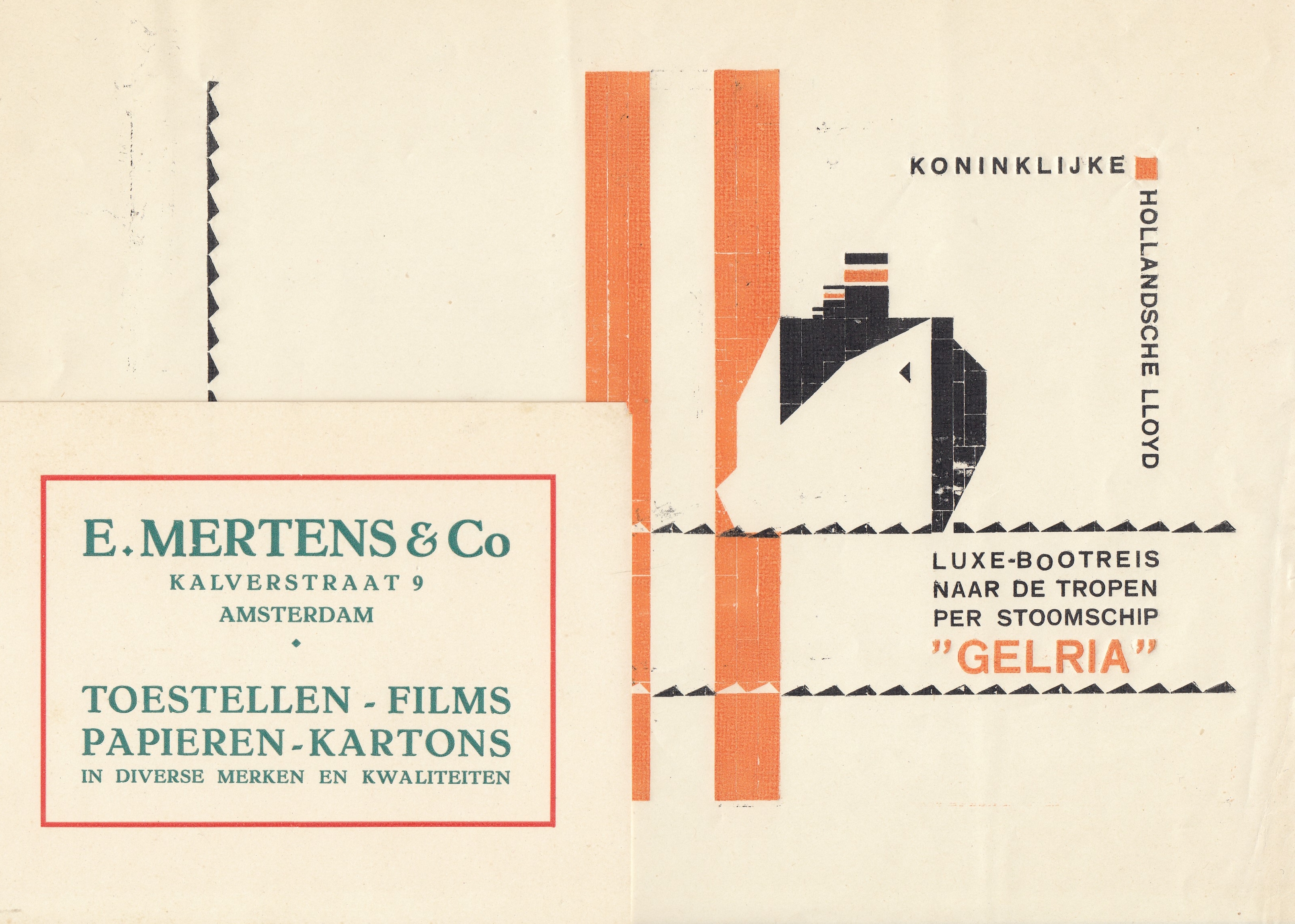 5. FRIGGE, HOTEL Afstanden van en naar Grand-Hotel Frigge, Groningen. Ingenieuze kartonnen afstandswijzer: ‘Hoe ver is het van … naar Grand-Hotel Frigge. Met draaischijf en open vakjes voor plaatsen in Nederland en kilometertallen. 28 x 9,5 cm. Grijs karton met opdruk in rood, groen en blauw. Draaischijf wat versleten, met krabbels en droedels (‘ Piet!!’). Ook met een foto van het hotel en de daarnaast gelegen bioscoop Lux, ca. 1935. Wat vlekjes en slijtage. Maar leuk!