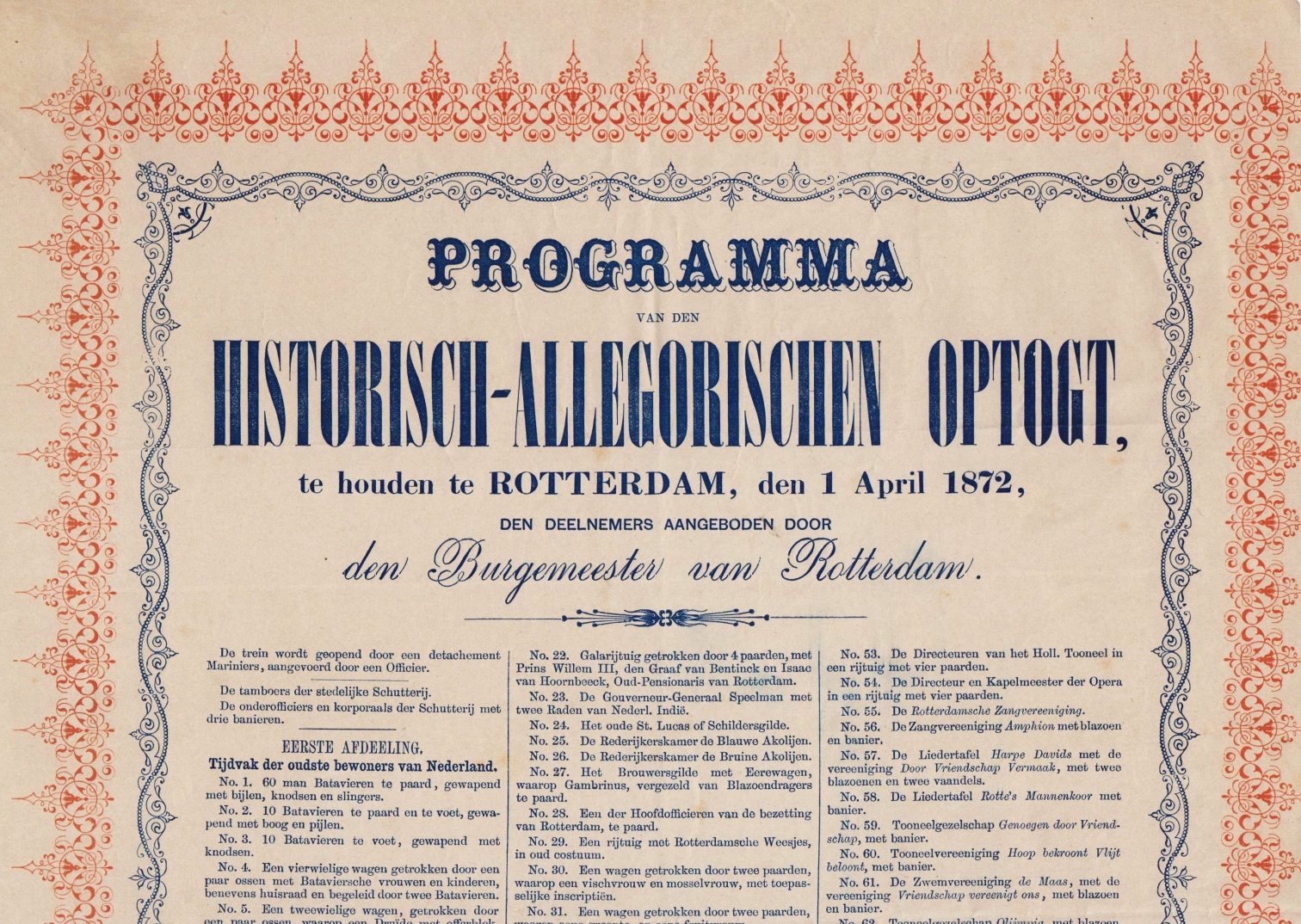 1. (BEATRIX, Prinses) Officiëel programma van de feestelijkheden ter gelegenheid van de Blijde Gebeurtenis in ons Vorstenhuis. Een nieuwe Oranje-appel wordt toegevoegd. Dordrecht, zonder uitgever, Januari 1938. Geniet met oranje omslag. 8 p. Wat gevlekt en gekreukt.