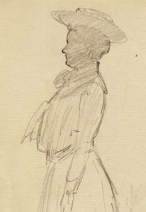 * Driekwart-portrettekening van een staande jonge vrouw met hoed, van wie het gezicht in schaduw is gehuld. Het profiel van het gezicht, de houding en de breedgerande hoed roepen de kenmerkende gestalte van koningin Wilhelmina in gedachte, zoals zij er in de periode na haar huwelijk (1901) uitzag.