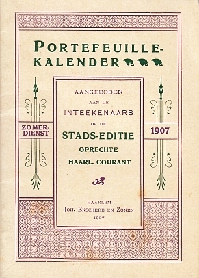 4. FRISIA Fryslan Kalinder 1924. Ljouwert, W.A. Eisma & Co., [1923]. 24 x 16 cm. Calendar between two cover leaves. Printed in blue, every week with a poem or a motto. With the original cords. Ticket and rubberstamp of the Friesch Genootschap library. A bit worn.