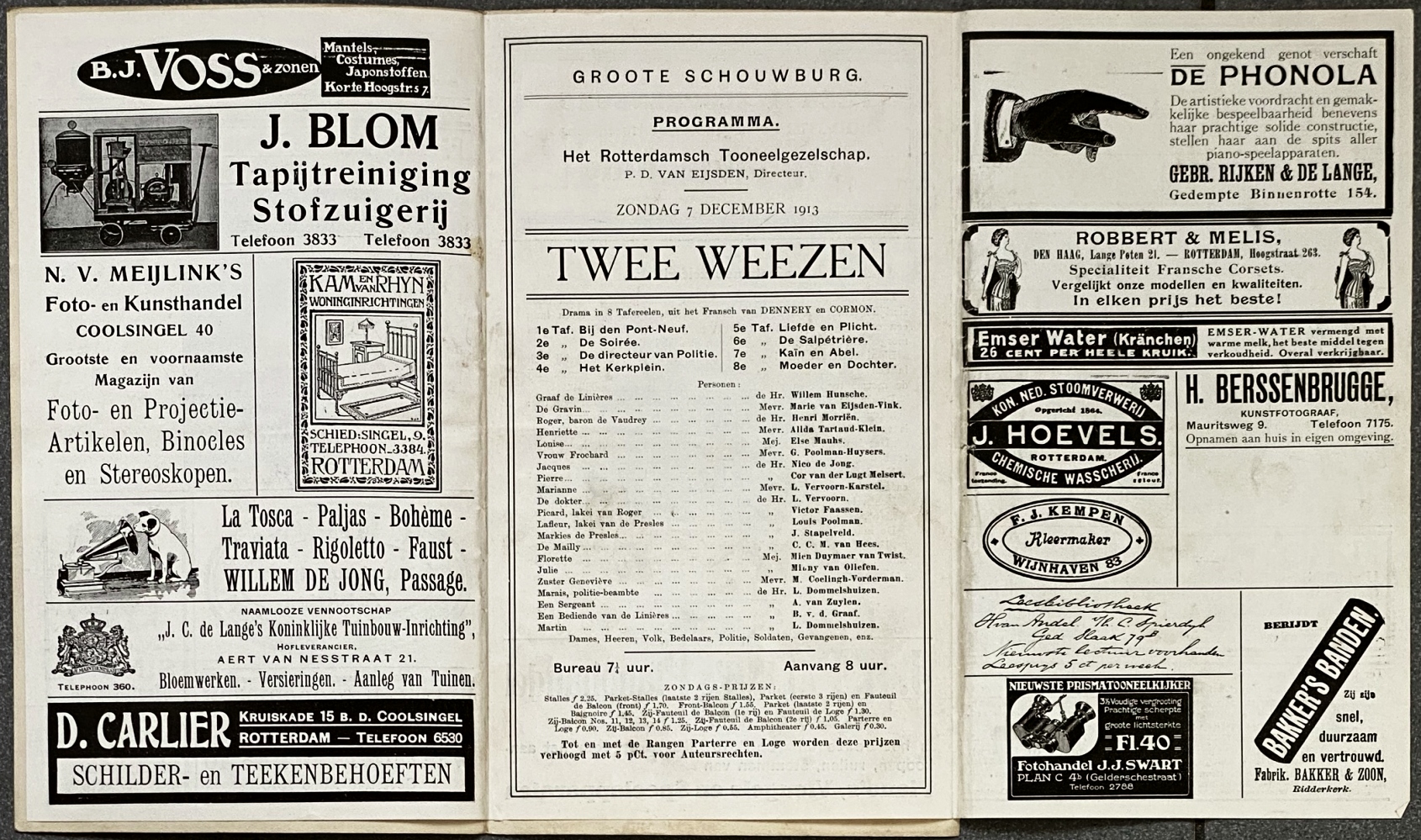 * Nieuwe Kunst in optima forma: omslag van zwaar papier met rijke vergulding en blindstempeling. Binnenwerk omvat de teksten van de dialoog ‘Proloog’ van M.G.L. van Loghem, vertolkt door Rika Hopper en Anna Klaasen, het Brautlied uit Lohengrin en een fragment van de Götterdämmerung, plus het veelomvattende galaprogramma, gevat in lichte botanische sieromlijstingen van Nieuwenhuis. Ondanks de lichte schade een jugendstilpublicatie om trots op te zijn.