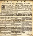29. WILLEM III, Koning Het zilveren Krooningsfeest van Koning Willem III. 12 Mei 1874. (Met twee andere gedenk-affiches van het jubileum van koning Willem III). 1. Den Haag, Ch. van Lier, 1874. 65 x 48 cm. Eenzijdig bedrukte lithografie. Hoekje ontbreekt, wat roest. Koning Willem III in zijn hermelijnen mantel omgeven met een afbeelding van de watersnood in de Bommelerwaard, de inpoldering van de Haarlemmermeer, de brug over de Moerdijk, de opening der Vlissingse Havenwerken en het monument op het Plein 1813. En een stel gezellige putti.