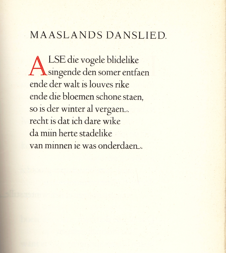 23. NOTERMANS, Jef De Mosaanse minnezanger Henric van Veldeke. (Nr. 3 van 160 genummerde exemplaren). Maastricht, ‘De Nachtuilen’ (J.W. Veltman), 1958. 34 x 22 cm. Ingenaaid. 48 p. Met een portret van Hub. Levigne. Gezet uit de Lutetia van Jan van Krimpen en gedrukt in rood, blauw en zwart op Pro Patria-papier van Van Gelder in 160 genummerde exemplaren. 1e druk. Goed exemplaar.