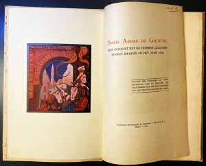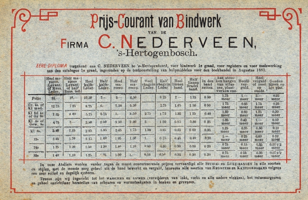 Dit is een bijzonder exemplaar gebonden in oranje marokijn, met op de voorkant in blauw gedrukt een kaart van Nederland onder een ingelegd, in blauw en oranje op wit papier gedrukt wapen van Nederland. Onder de kaart staat de titel van het boek in een gotisch type. Achterop een kaart van de West en de Oost! Mogelijk een uitgeversband, gezien de bestempeling – de cliché’s moeten kostbaar zijn geweest. De boekband is bescheiden op een van de laatste schutbladen voorzien van een blindstempel: ‘Launder/ New York’. Het betreft hier de in Engeland geboren handboekbinder Alfred W. Launder (1867-1952), die vanaf 1929 de binder was van het Metropolitan Museum of Arts in New York, een man met grote naam in de Amerikaanse boekbinderswereld van zijn tijd.